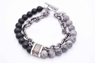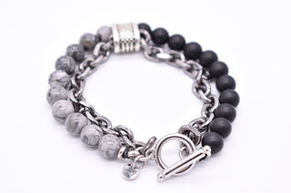Parisi Armband- Edelstahl Kette - Grauer Jaspis und Schwarzer Achat Natursteine - Mann - Herren - Inkl. Weiße Schmuckschachtel